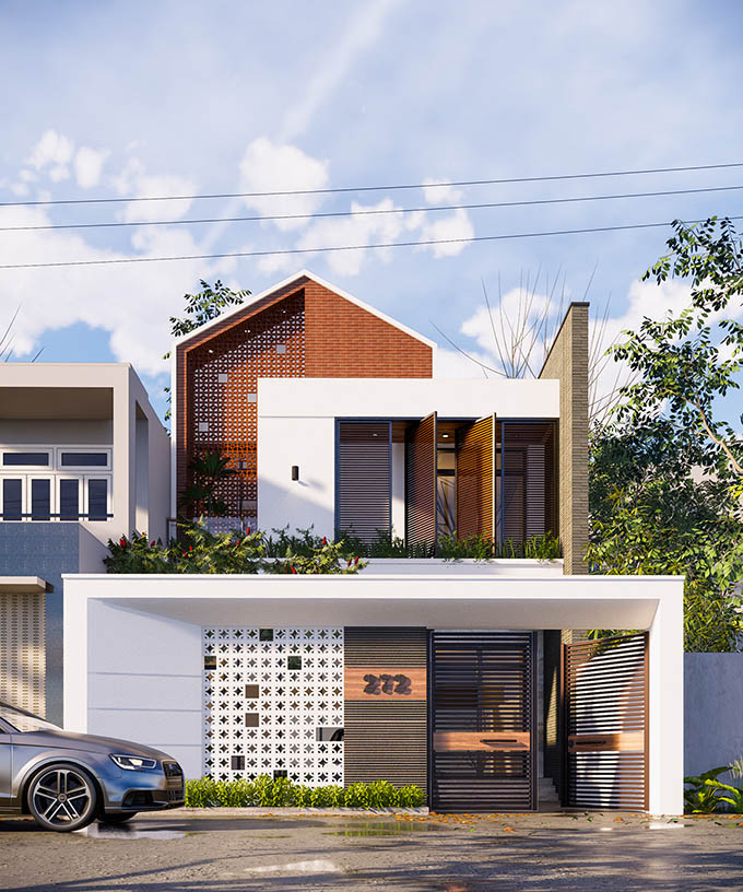 Nhà phố lô góc giả biệt thự. Từng tạo hình khối vuông vắn nhưng không bị gò bó, dập khuôn mang đến sự kiên cố cho ngôi nhà. Màu trắng thanh lịch, tone màu sáng nổi bật. Yếu tố thiên nhiên được cài cắm vào bất cứ không gian nào có thể qua những chậu cây xanh, mái che trang trí và ban công và bồn hoa nhỏ. Tất cả các phòng đều thiết kế cửa sổ kính, quay ra mặt tiền, lấy gió và ánh sáng. Giúp phòng được lưu thông không khí, tránh ẩm mốc, hay toát mồ hôi khi trời nồm.